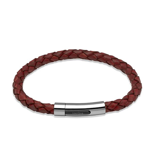 This Unique & Co bracelet features woven brown leather and a stainless steel clasp.
