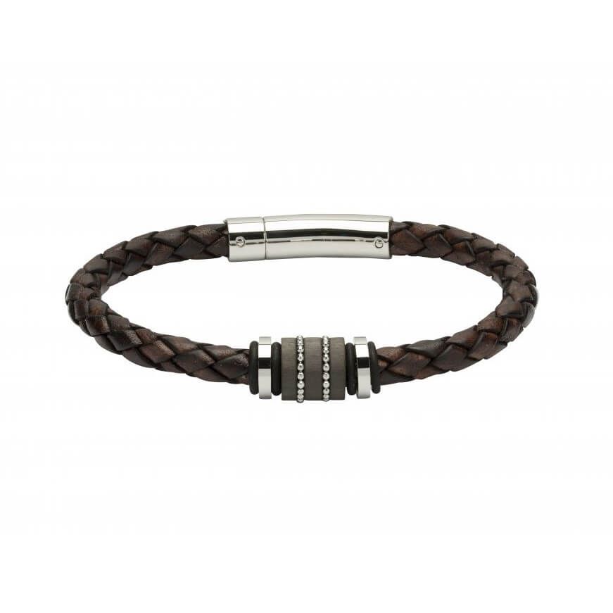 This bracelet by Unique & Co features plaited brown leather with beads made from stainless steel and carbon fiber.