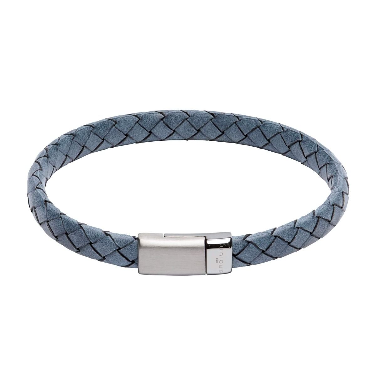 This bracelet by Unique & Co features a light blue plaited leather with a stainless steel clasp.