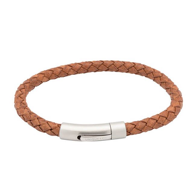 This Unique & Co bracelet features woven tan brown leather and a stainless steel clasp.