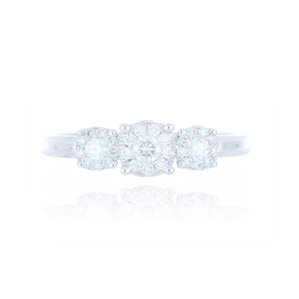 A beautiful ring crafted in 18ct white gold with three diamond clusters running along the finger. This ring sparkles with your movement and is a timelessly elegant in design.