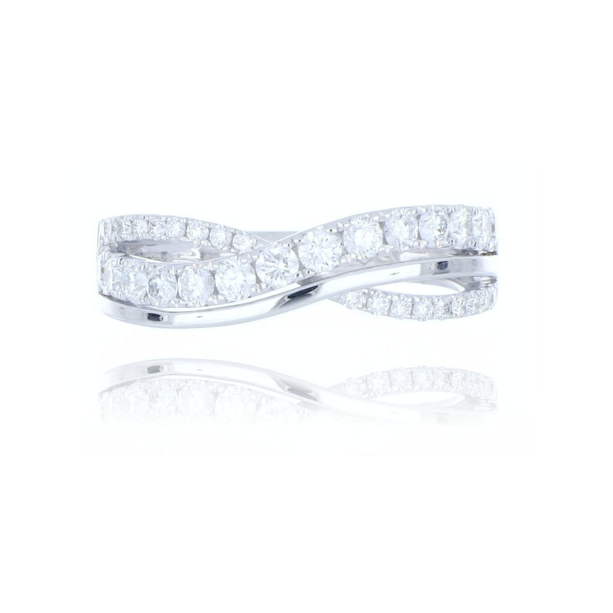 This beautiful ring is crafted in 18ct white gold and features three gorgeous bands crossing over the finger. Two of the bands are studded with sparkling diamonds creating an impressive design. Wear alone for simple beauty or pair with a solitaire ring for a look with impact.