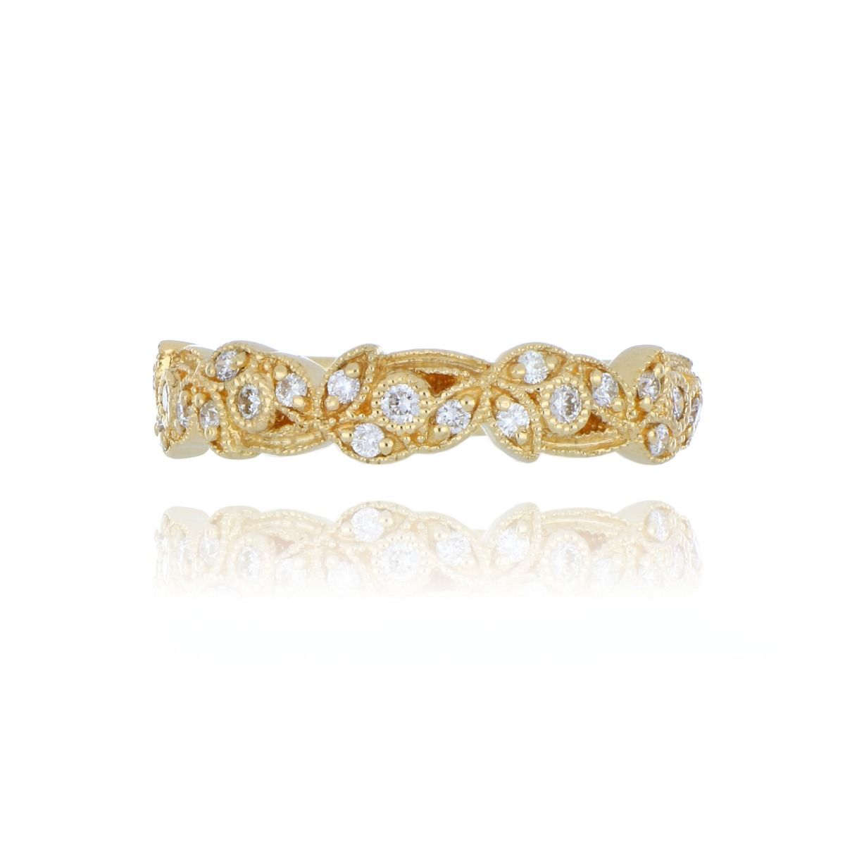 This stunning ring is crafted in 18ct yellow gold and features a floral and leaf design sparkling with beautiful diamonds.