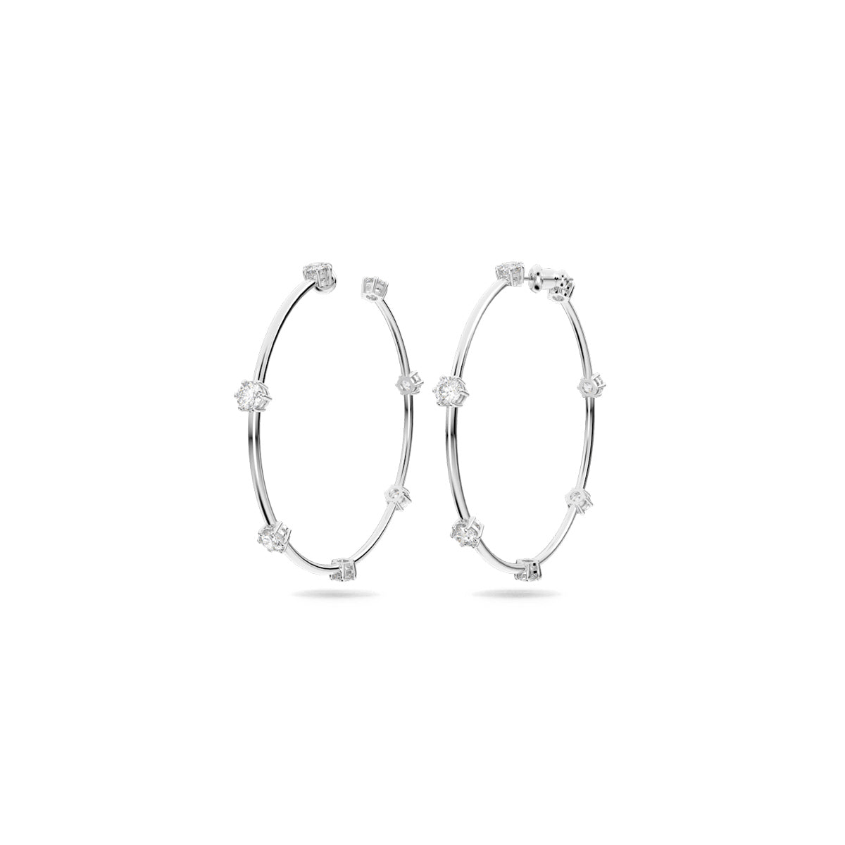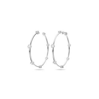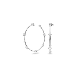 These alluring hoop earrings from the Constella family are instant stardust. Designed to evoke constellations in the night sky, this pair features round, brilliant-cut stones on a rhodium plated setting for a modern take on solitaire jewellery. Mix yours with other metals for elegance with an edge.
