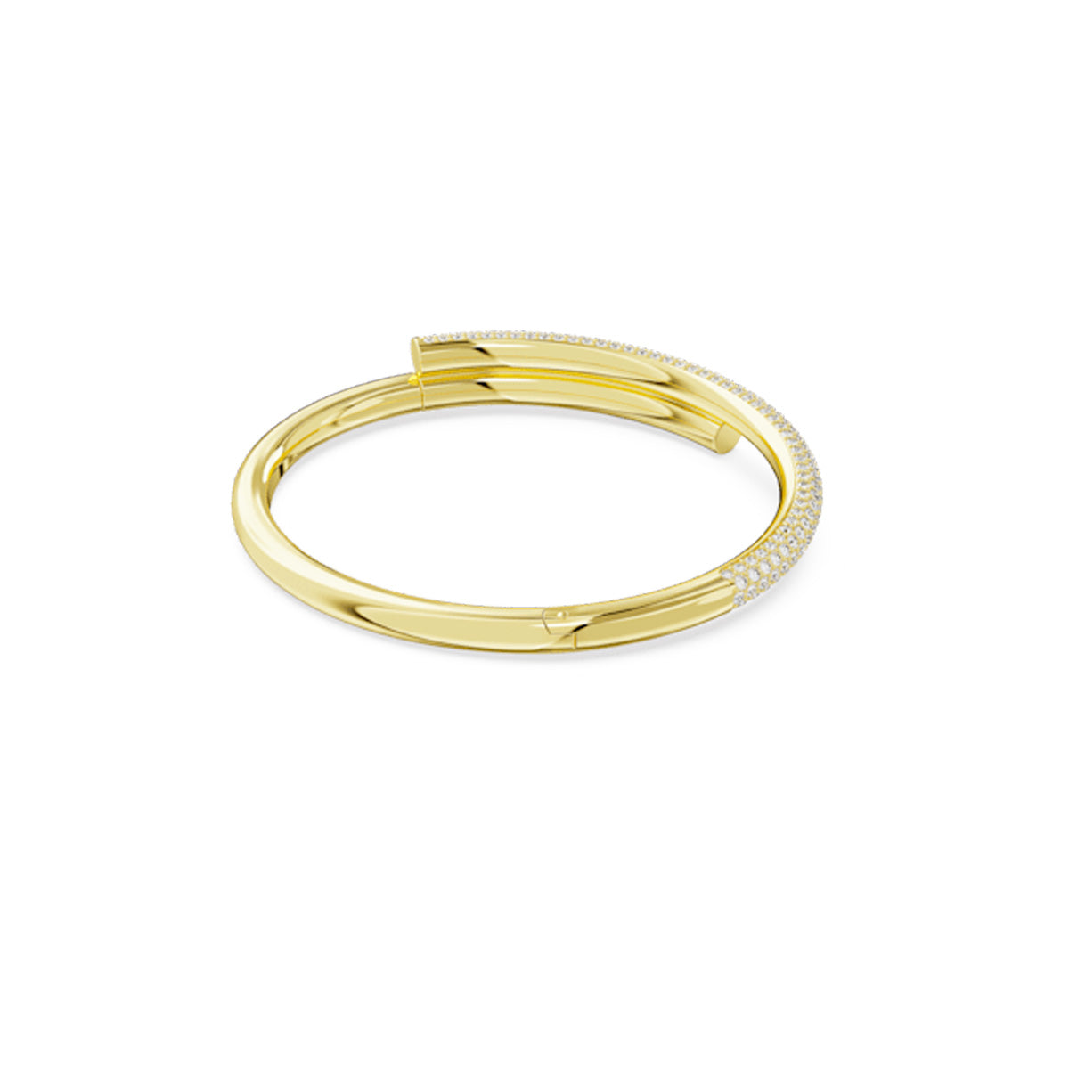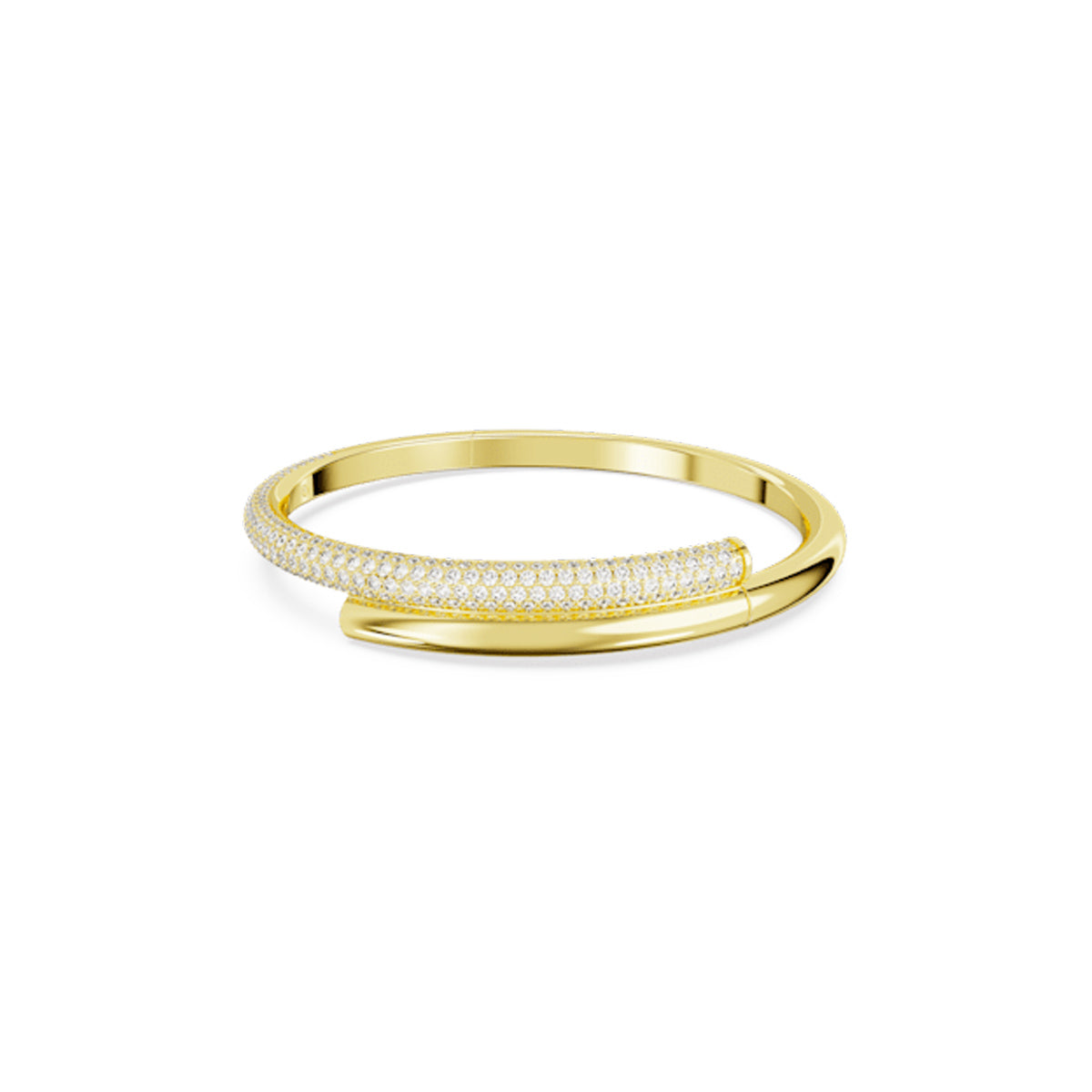 With a sleek loop around the wrist, this crossover bangle delivers maximum impact. The tubular design beautifully blends classic and contemporary styles, with a gold-tone plated band that is half embellished with all-over clear pavé. For a flawless finish, the bracelet is crafted with a hidden magnetic closure. A luxurious piece that will enhance any style you wear.