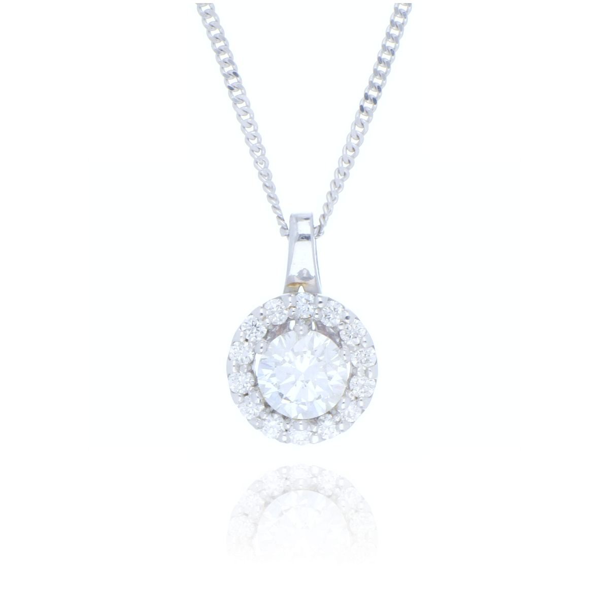 A classic and elegant diamond pendant necklace. The pendant has a central round brilliant cut diamond which sparkles beautifully and is surrounded by a halo of dazzling diamonds. Crafted in gorgeous 9ct white gold, this diamond cluster necklace is the perfect piece to wear on every occasion.