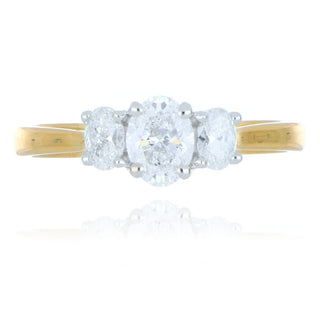 The past, present and future come together to form this stunning three stone, diamond trilogy ring Crafted in 18ct yellow paired with a platinum setting, this ring features a lager oval cut principal stone, accompanied by two graduated oval cut diamonds either side; each secured in place by an individual 4 claw settings. The central diamond is accompanied by an independent Diamond Grading Certificate. Details below.