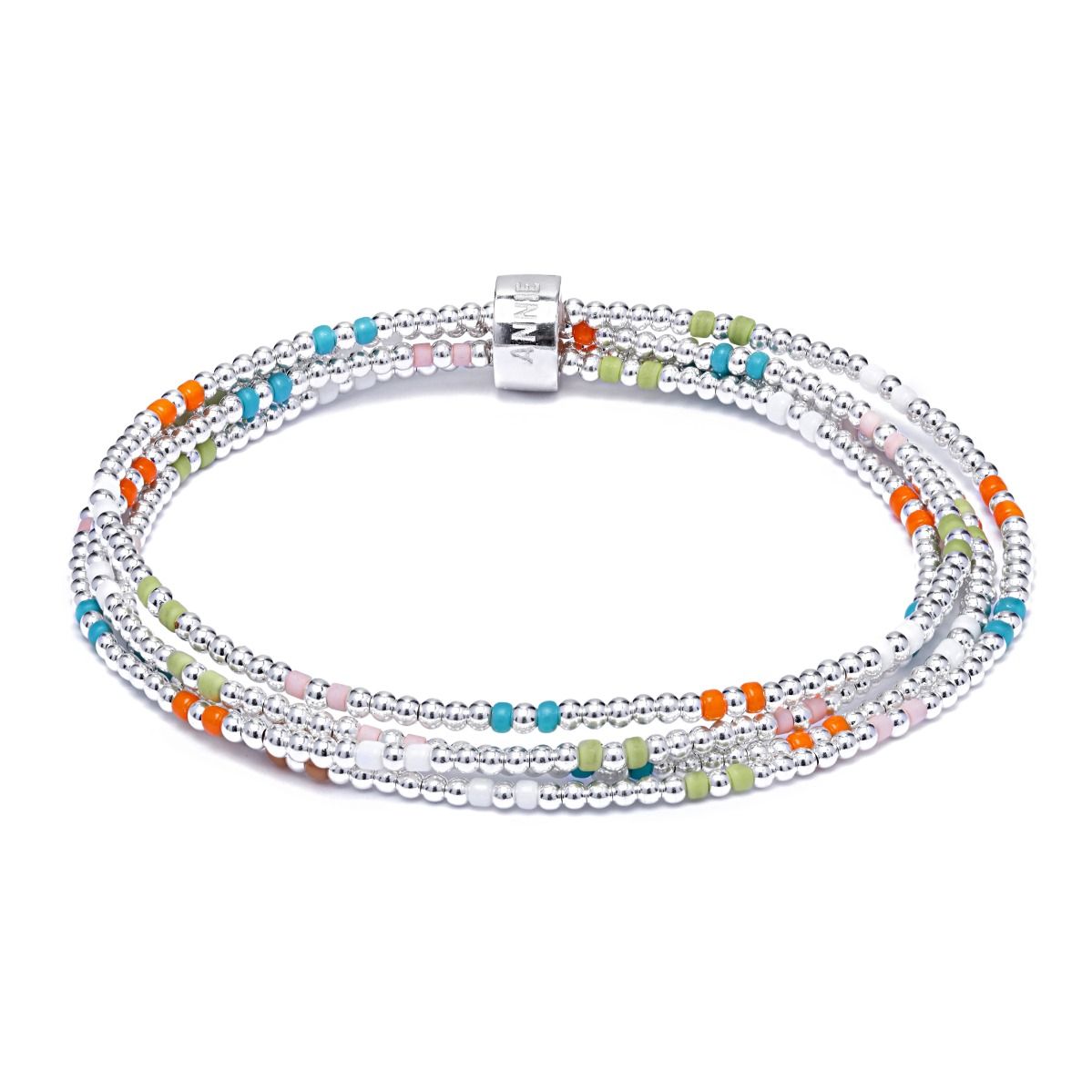 This Sterling Silver beaded bracelet is threaded onto high quality jewellery elastic, between Blue, Orange, White, Green and Pink beads.