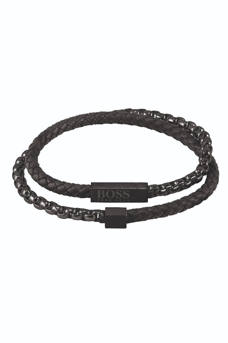 BOSS gents bracelet rom the Blended collection. Features black braided leather and black IP stainless steel chain double wrap design with black IP stainless steel branded magnetic closure. Length: 190mm Width: 5mm