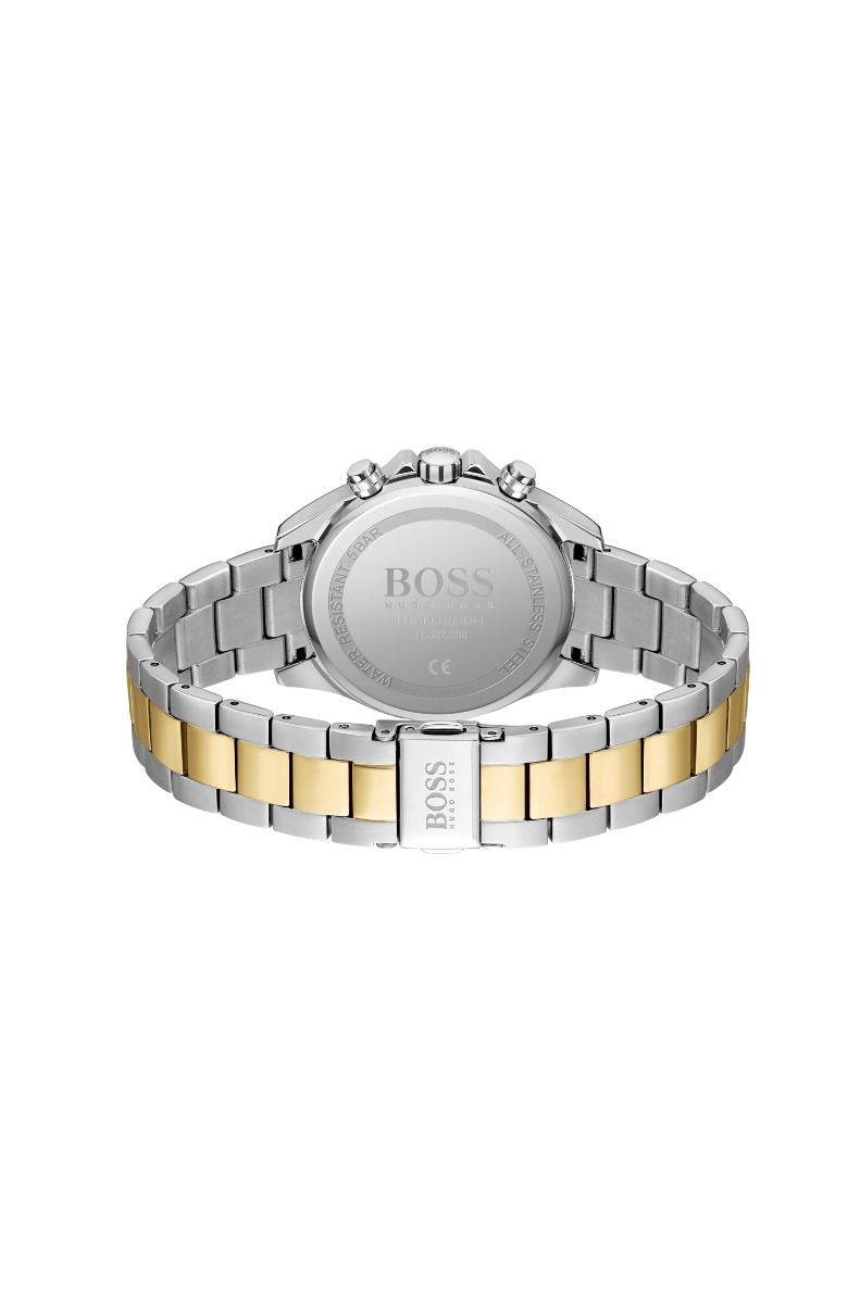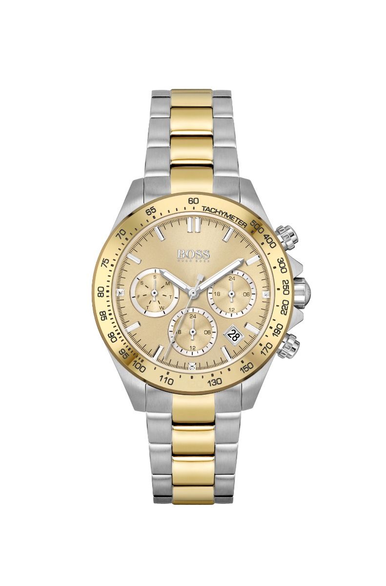 BOSS ladies watch from the Novia family. Featuring a 38mm stainless steel case, gold bezel, gold sunray dial with crystal markers, tachymeter bezel, two toned gold IP and stainless steel bracelet and push button deployment. Water resistant to 5ATM