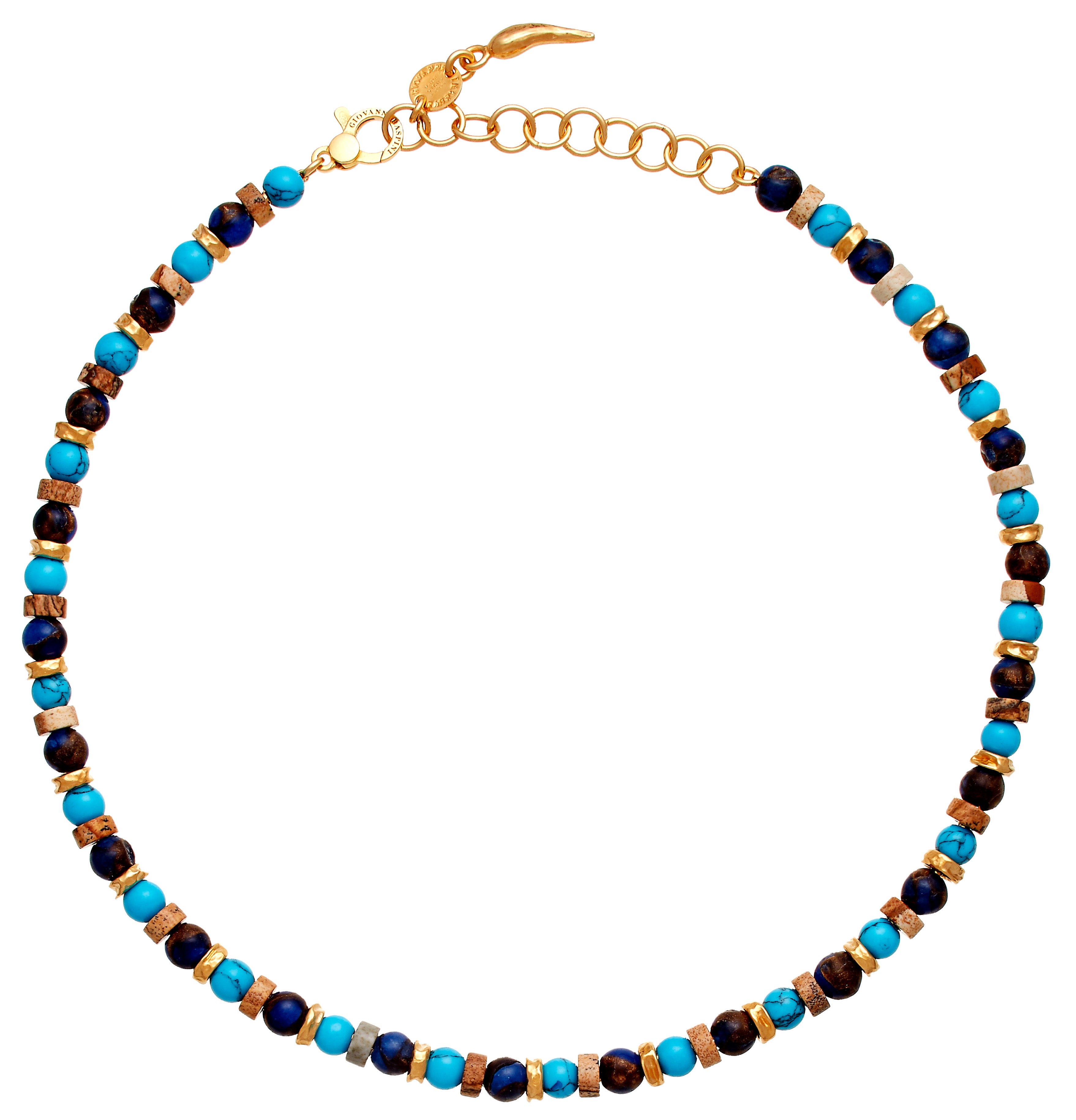 Giovanni Raspini’s Yellow Gold Plated Tuareg Small Necklace features yellow gold plated sterling silver beads, spaced between turquoise, blue agate, ruin marble and bronzite details. Adding texture and colour to your outfit, this necklace can be worn alone or layered with your favourite yellow gold plated necklaces.