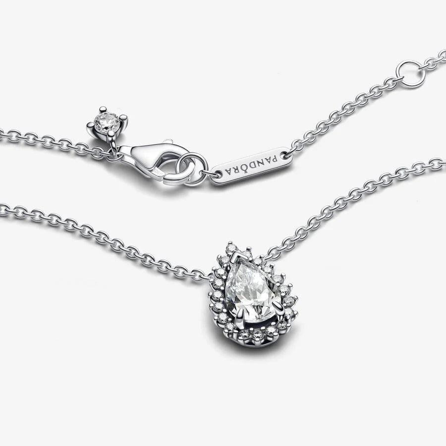 Add some sparkle to your everyday with the Sterling Silver Sparkling Pear Halo Necklace. This unique necklace features a reimagined pear shape and adds a touch of the iconic pavé halo from the Pandora Timeless collection. The pendant's stone is held in place by one V-shaped and two elongated prongs, creating a stunning play on dimension. The pear-shaped pendant is adjustable in length and moves freely along the chain. Whether worn alone or layered with other chains, this pendant effortlessly combines dazzling stones with classic design. This necklace chain has a maximum length of 45cm.