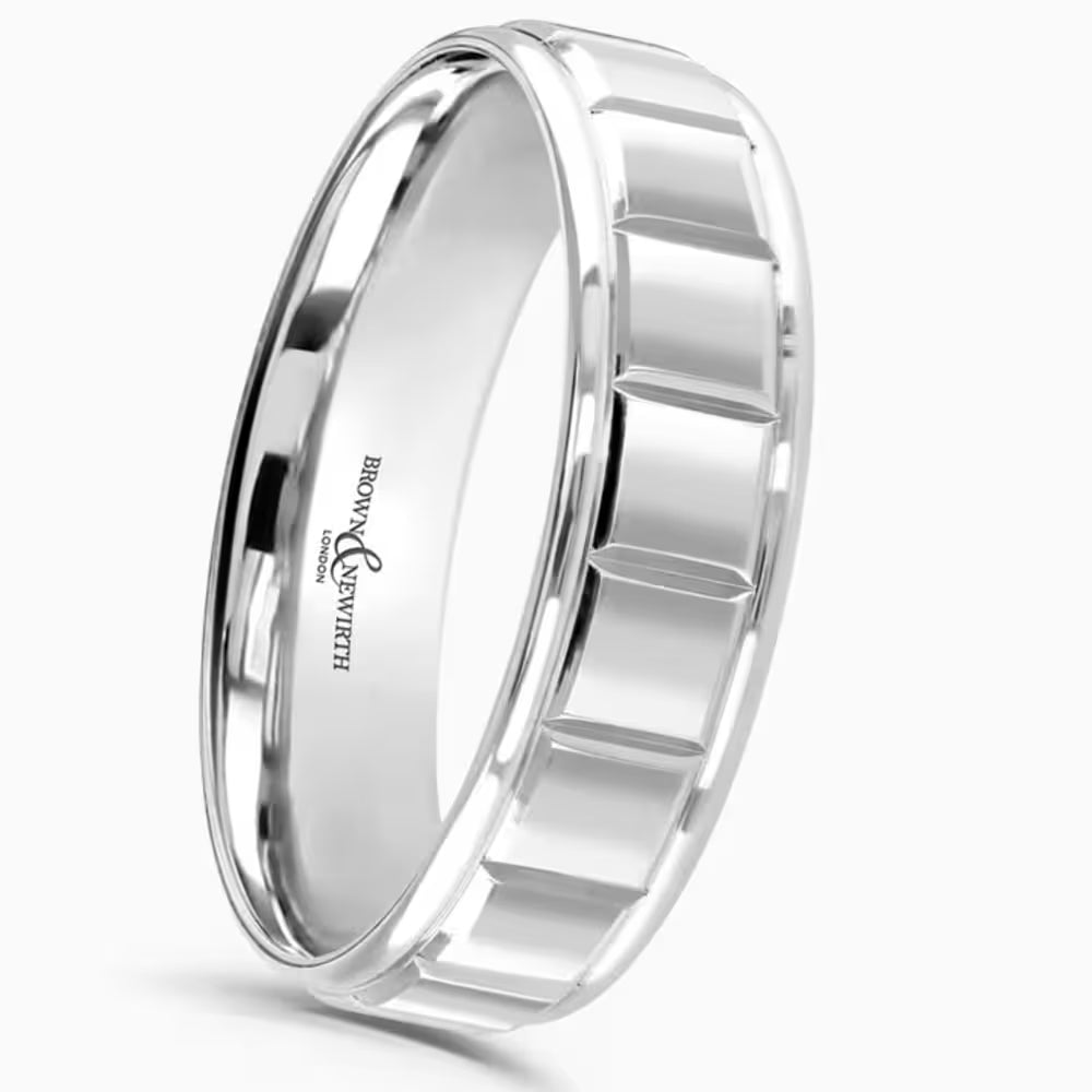 This 5mm platinum wedding ring brings a contemporary edge with its flat top profile and playful chocolate bar-inspired cube pattern, adding texture and charm to your look. The polished drop-rolled edges create a smooth, shiny frame that balances the bold design with sleek sophistication. Durable and stylish, this ring is perfect for those who want a unique blend of fun and elegance to celebrate their special bond.
