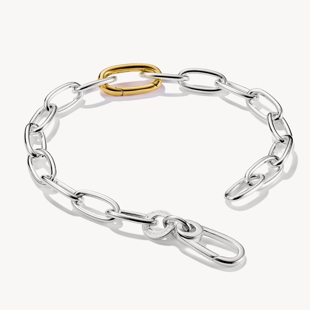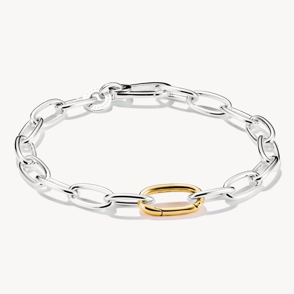 Craft your own meaningful jewellery combos with ease! The star of this charm bracelet is a bigger oval link plated in luxurious 18k gold, which opens up for quick charm attachment. Plus, you can clip lobster clasp charms onto the smaller chain links for endless mix-and-match fun. Made from recycled 925 silver with a chic bicolour twist, this playful bracelet lets you switch up your style daily while keeping your special memories close.