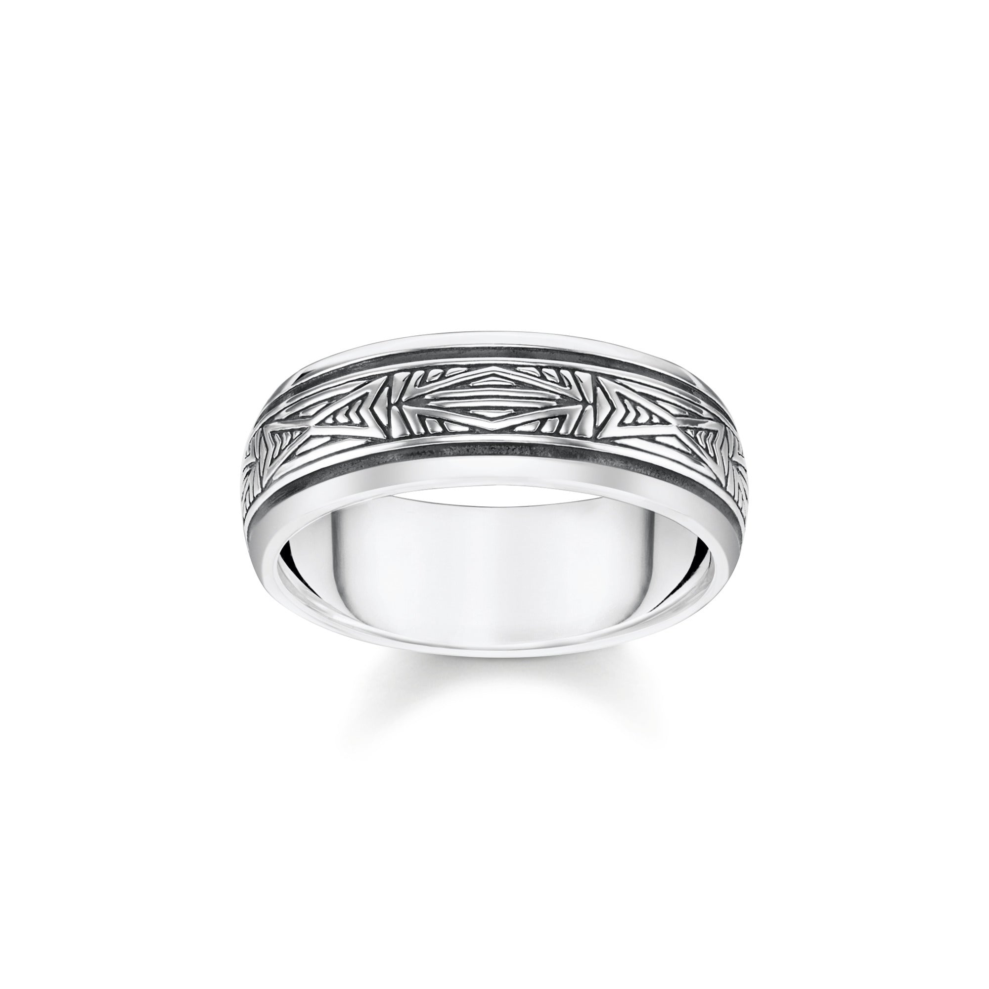 Thomas Sabo’s ornaments ring features oxidised sterling silver and a raised geometric pattern, inspired by modern architecture, which creates a tactile design.