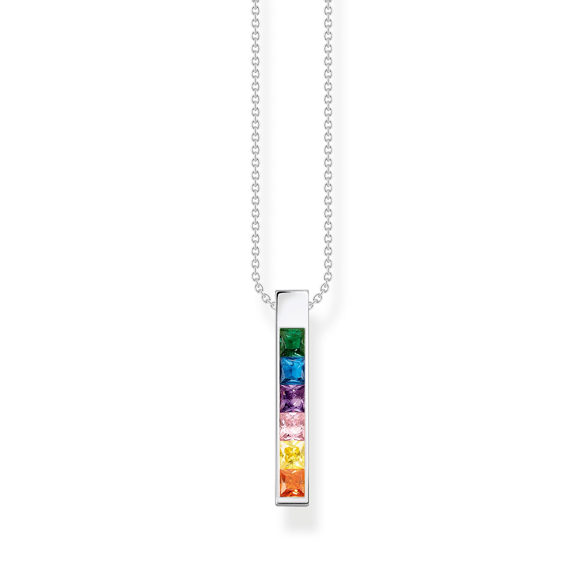 Thomas Sabo’s silver cuboid necklace features multi coloured princess cut stones, resembling a rainbow. This necklace adds the perfect pop of colour to any outfit. Wear alone or stack with other Thomas Sabo necklaces to create a layered look.