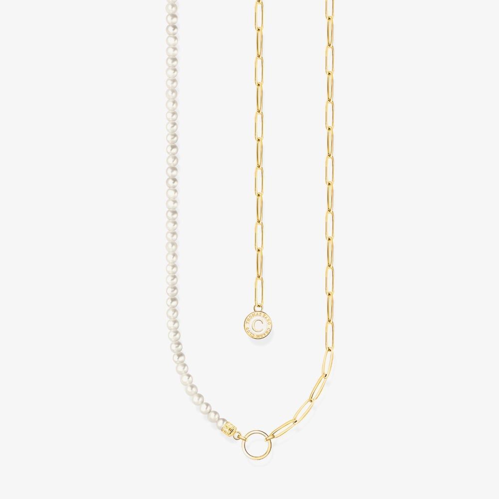 This captivating THOMAS SABO necklace combines high-quality 18ct yellow gold-plated sterling silver with fresh, lustrous pearls. Featuring an open circle charm carrier, it invites you to mix and match THOMAS SABO charms to fit your mood and style. Finished with an adjustable lobster clasp and a charming round Charm Club Charmista coin hand-painted with cold enamel, this 45cm necklace adds a playful, personal touch to any outfit.