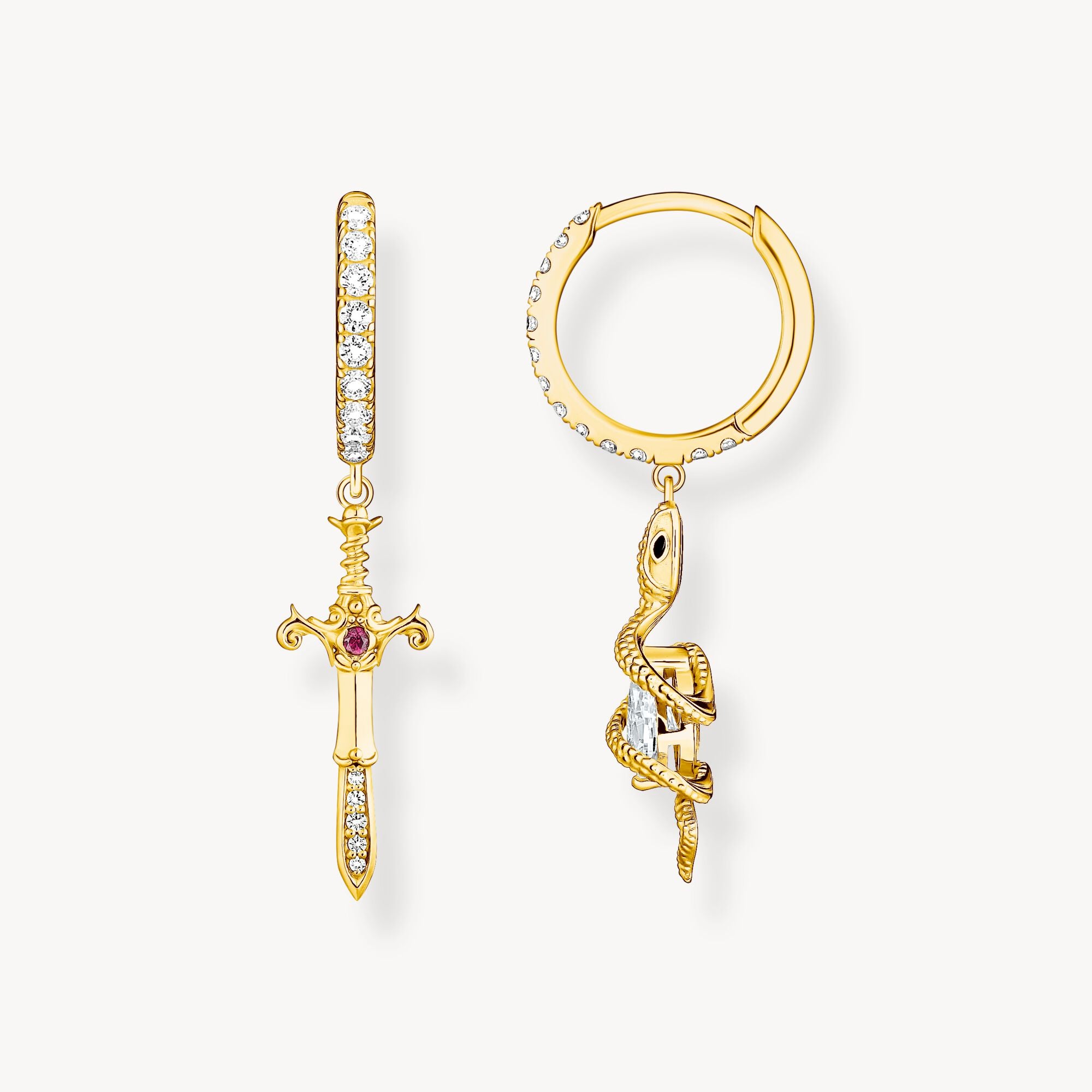 Tell your unique story with these fabulous hoop earrings adorned with mismatched pendants. Crafted from recycled silver, they feature high-quality 18k gold plating and small white zirconia stones. One pendant is sword-shaped and boasts intricate patterns and a red Lab Grown sapphire, while the other is a 3D snake with a drop-cut white zirconia stone. Its scales are mimicked by engraved lines and its expressive eyes are rendered in bold black cold enamel.