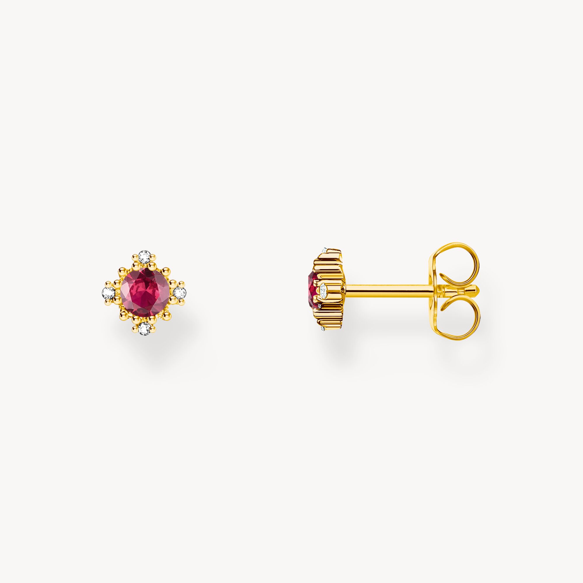 Add some pizazz to your look with these ear studs. Crafted from upcycled silver and coated in premium 18k gold, these studs feature a vibrant, red Lab Grown ruby at the centre, accented by dainty white zirconia stones. The vintage-inspired design is complete with these tiny, golden studs, perfect for daily wear or mix-and-match with your other favourite bling.