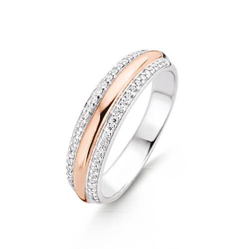 This beautiful ring by Ti Sento is crafted in silver and rose gold plate. A central rose gold plated band has a line of cubic zirconia running either side of it. Elegant and stylish.