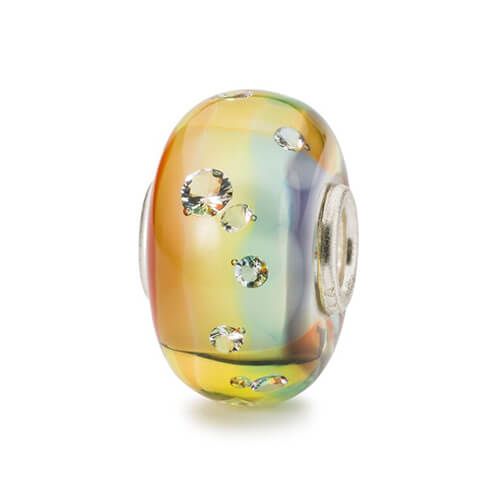 Find diamonds at the end of the rainbow with this beautifully colourful glass bead from Trollbeads. This crystal orb is embedded with 13 cubic zirconias. The bead is lined with a delicate pastel shades of the rainbow.