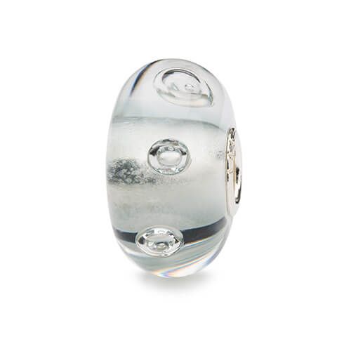 This glass bead by Trollbeads is formed in clear glass with a silver glimmer and bubbles.