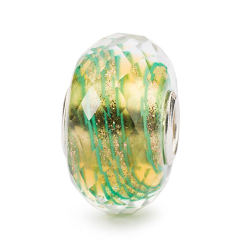 Walk the path of prosperity on an aisle of gold with this faceted glass bead by Trollbeads. Green strands and golden sparkles shimmer over a yellow background.