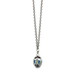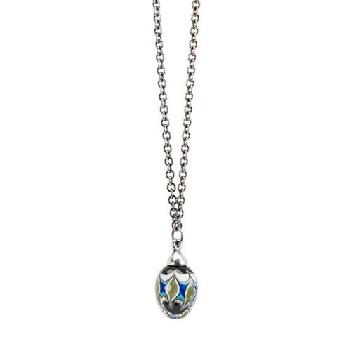 This sterling silver lockless chain from Trollbeads is fitted with a lovely glass pendant in blues, blacks and gold. Trollbeads may be slid onto the chain above the pendant without the use of tools.