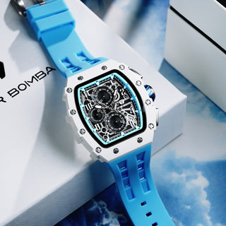 Introducing the Tsar Bomba 43mm Blue and White Elemental Series Quartz Watch, a timepiece that combines intricate design with exceptional precision. Featuring a bold blue and white color scheme, this watch is a statement of elegance and sophistication. Make a bold statement with Tsar Bomba.